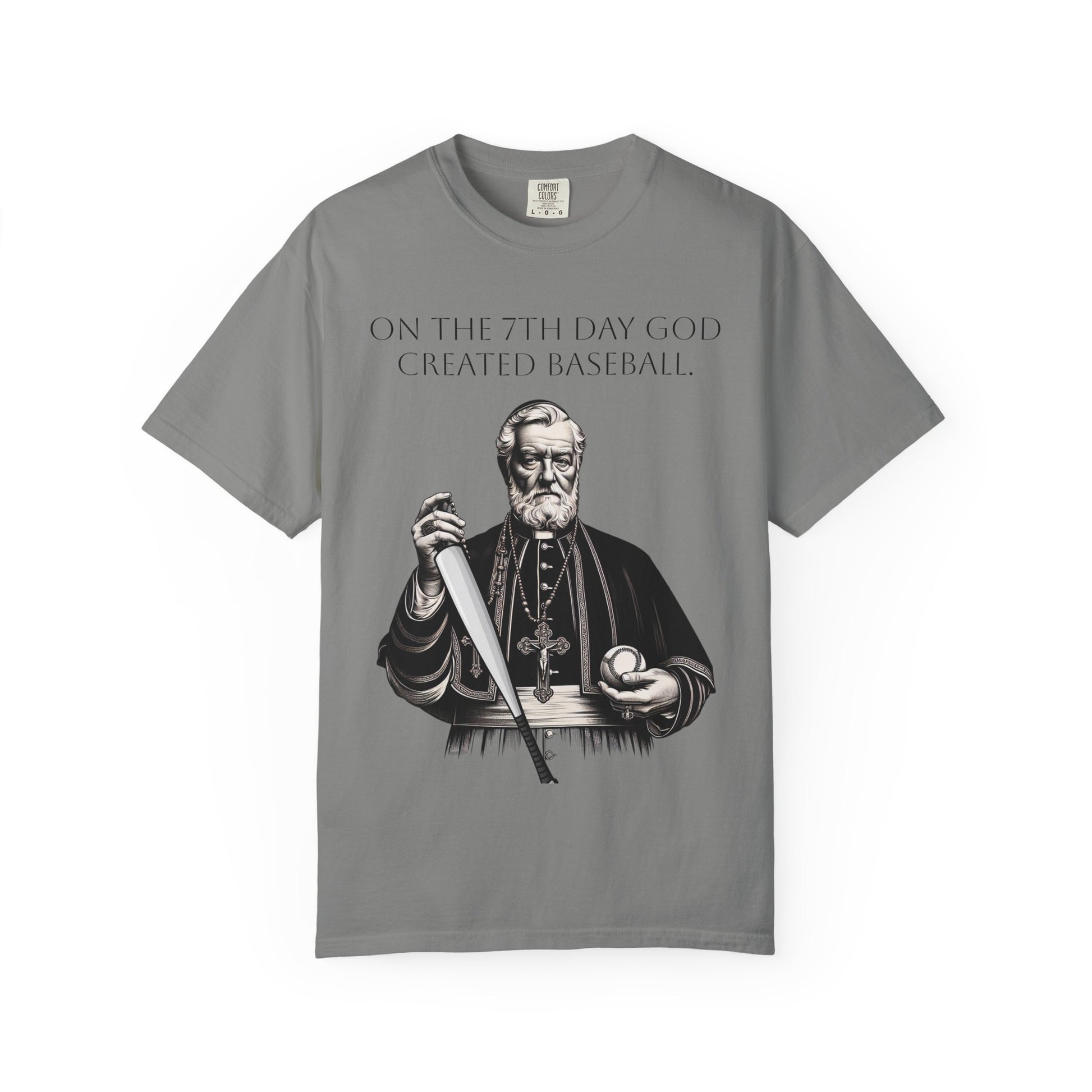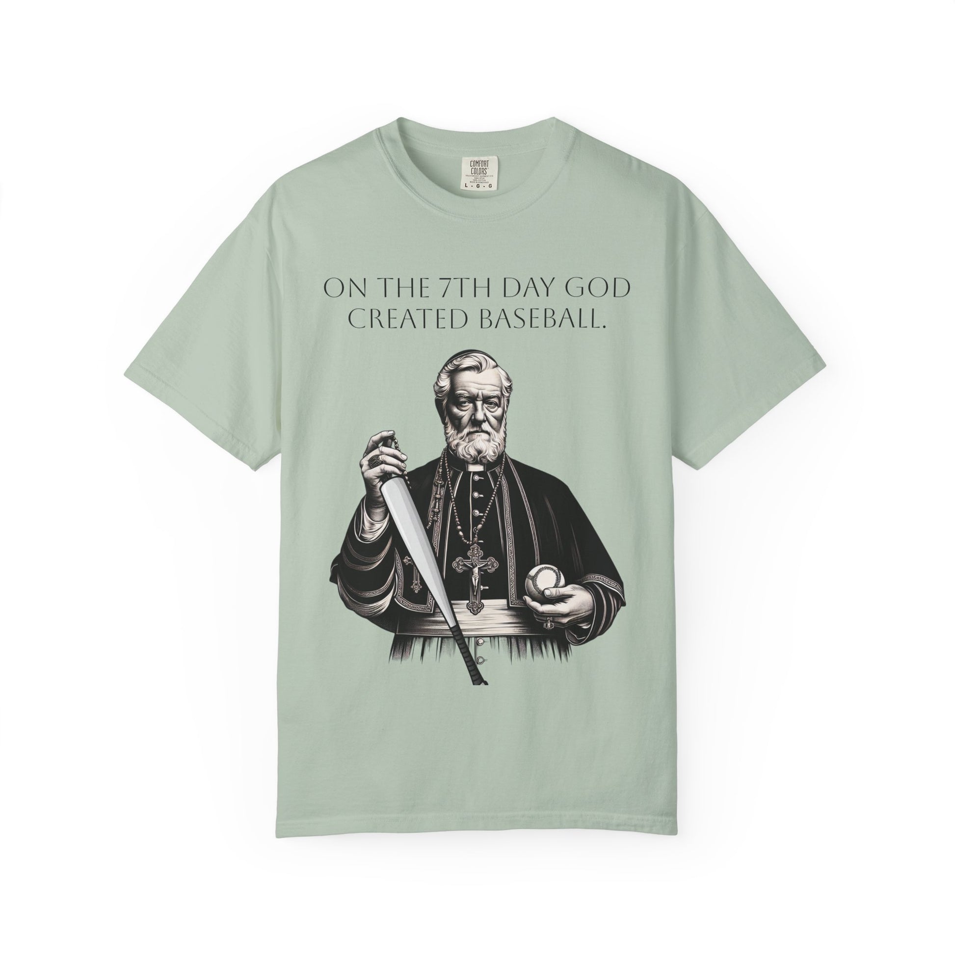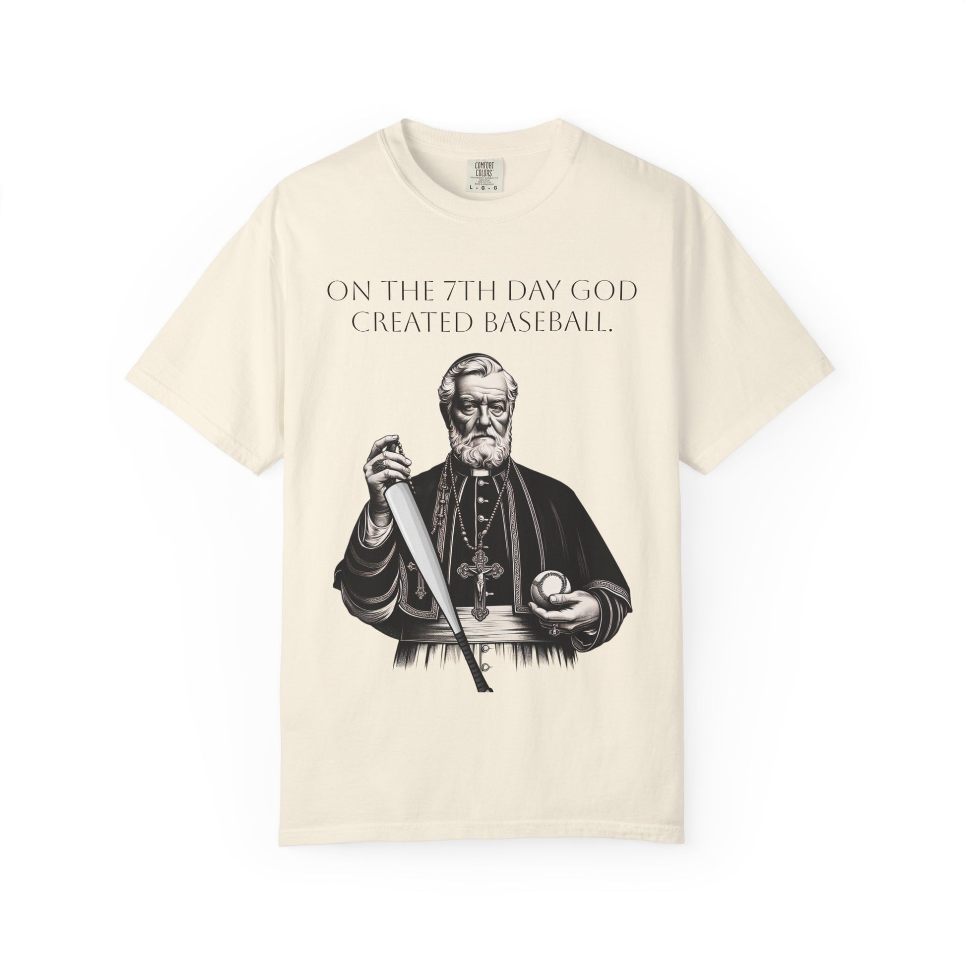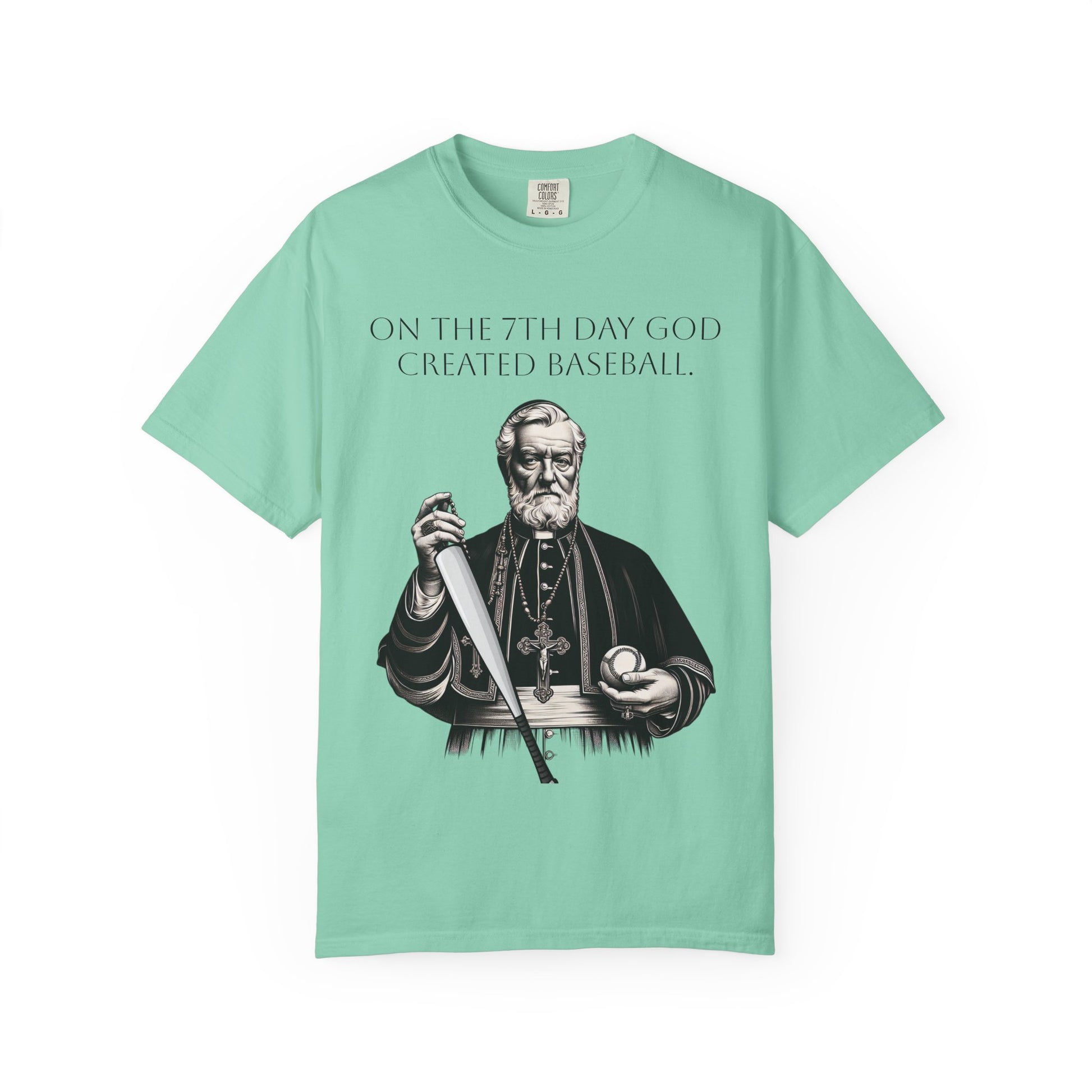 This fun shirt for baseball fans features a priest stating “on the 7th day God created baseball”. It gives a playful and light-hearted vibe, perfect for casual wear or attending baseball games. Ideal for baseball enthusiasts and Catholics alike, this shirt is relevant for baseball season, game nights, and religious celebrations.