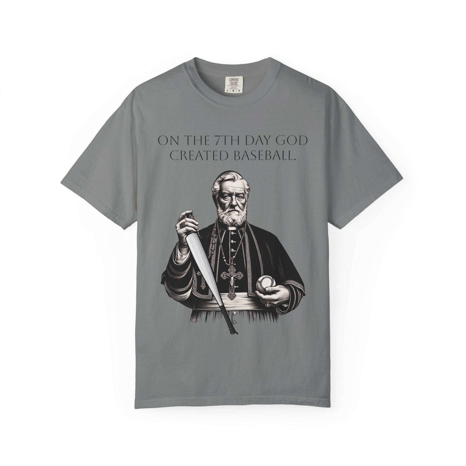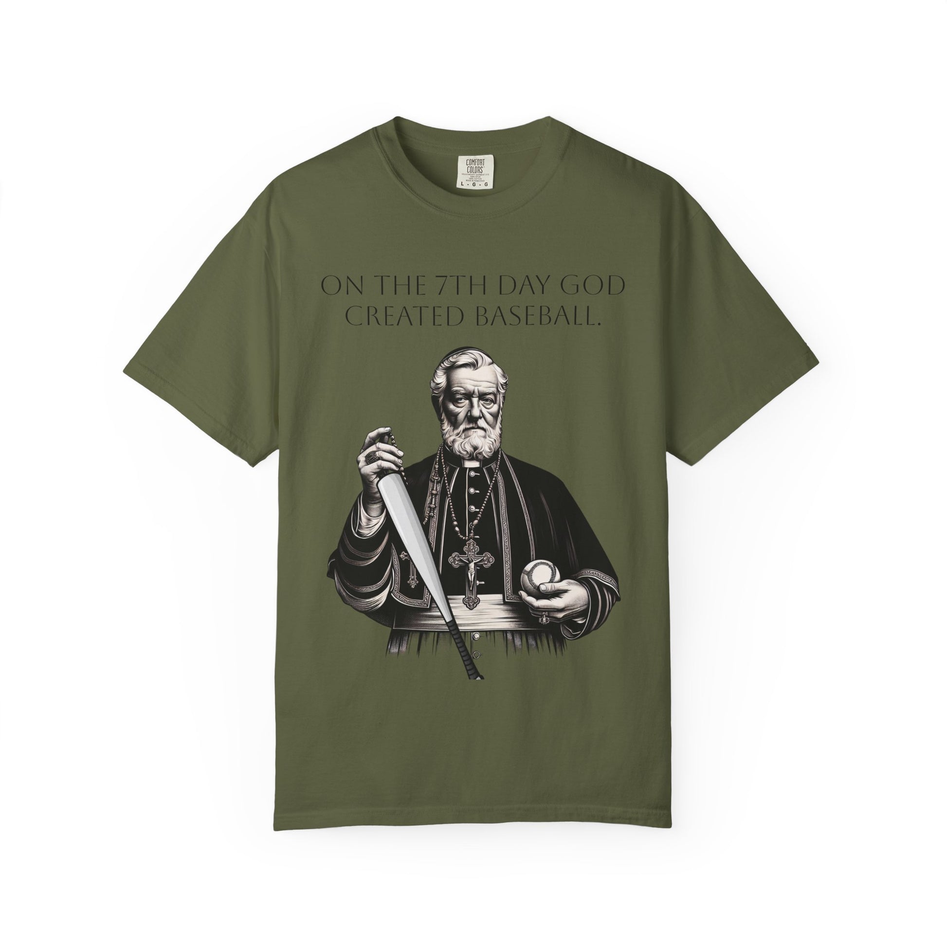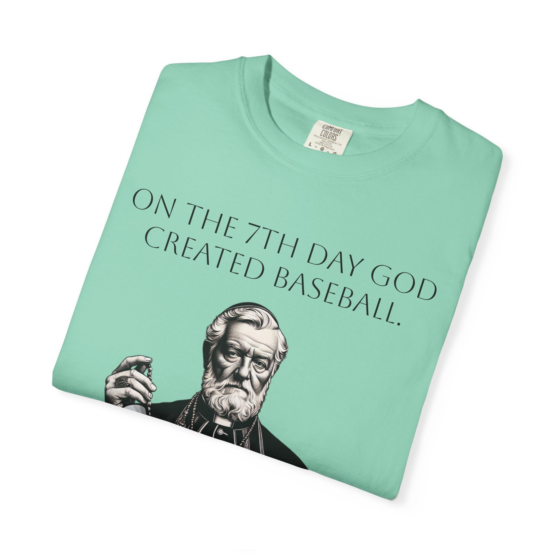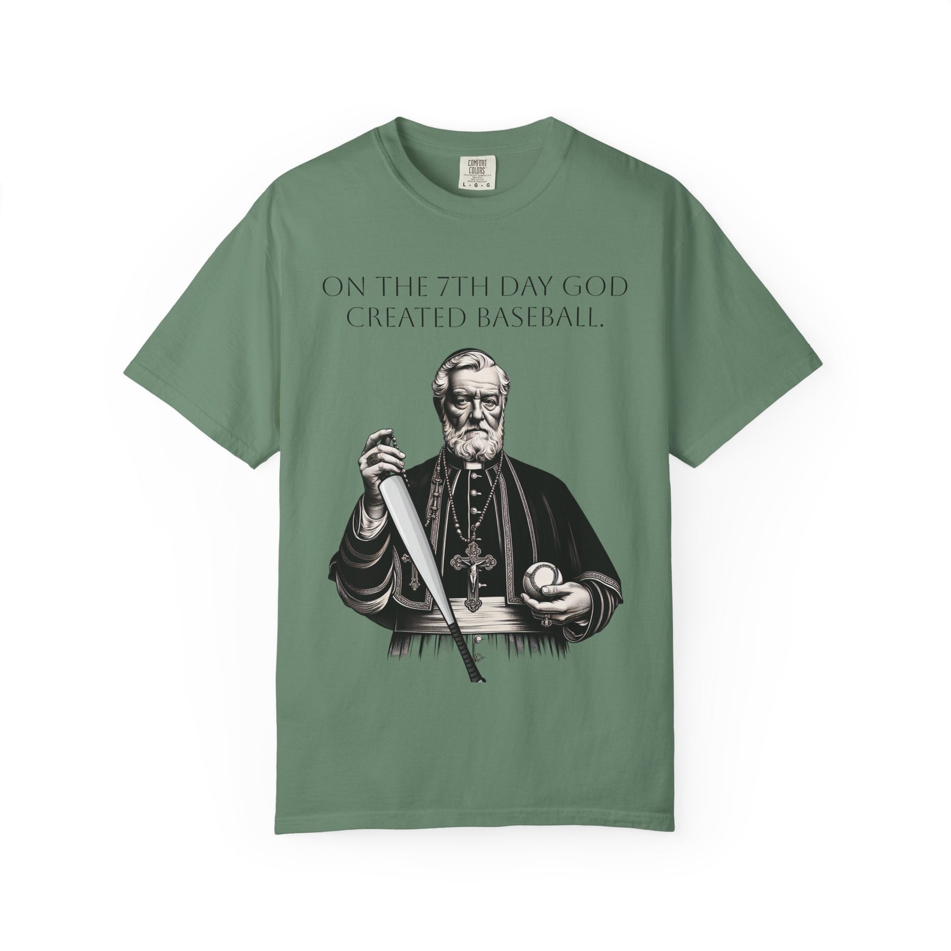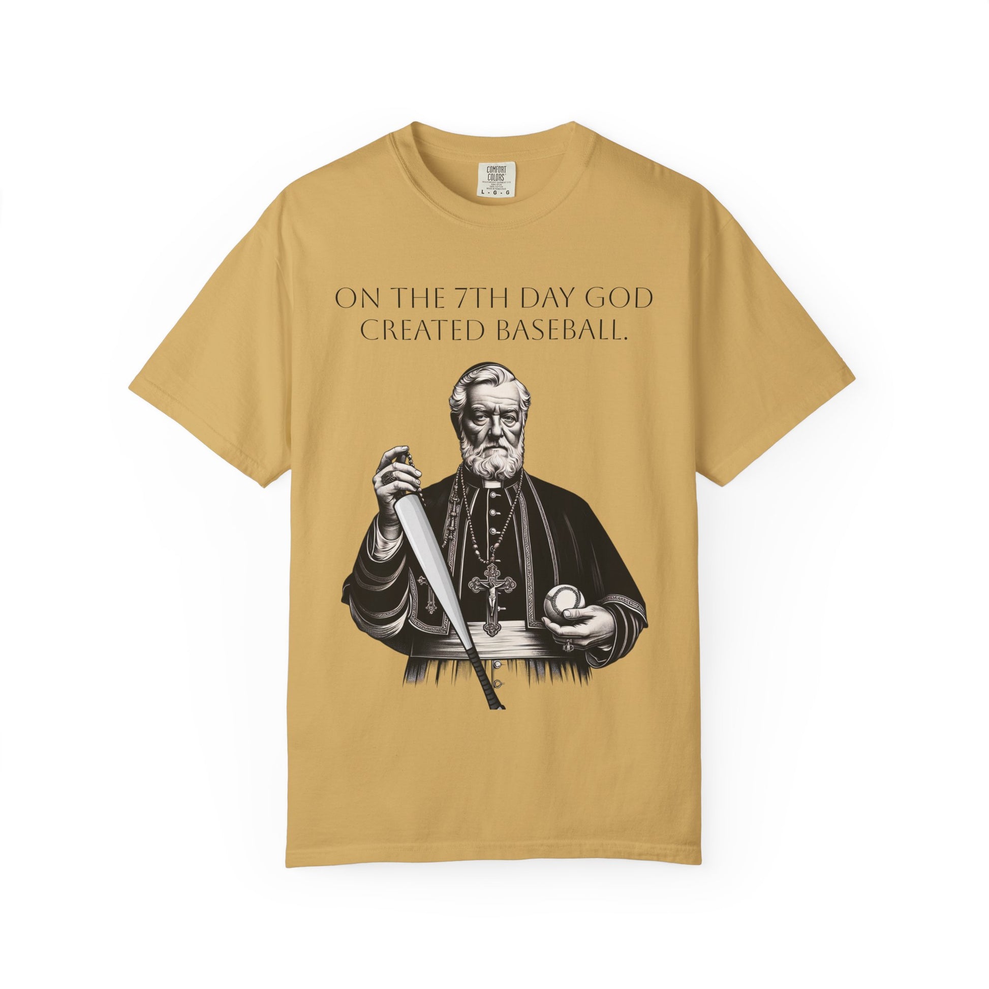 This fun shirt for baseball fans features a priest stating “on the 7th day God created baseball”. It gives a playful and light-hearted vibe, perfect for casual wear or attending baseball games. Ideal for baseball enthusiasts and Catholics alike, this shirt is relevant for baseball season, game nights, and religious celebrations.