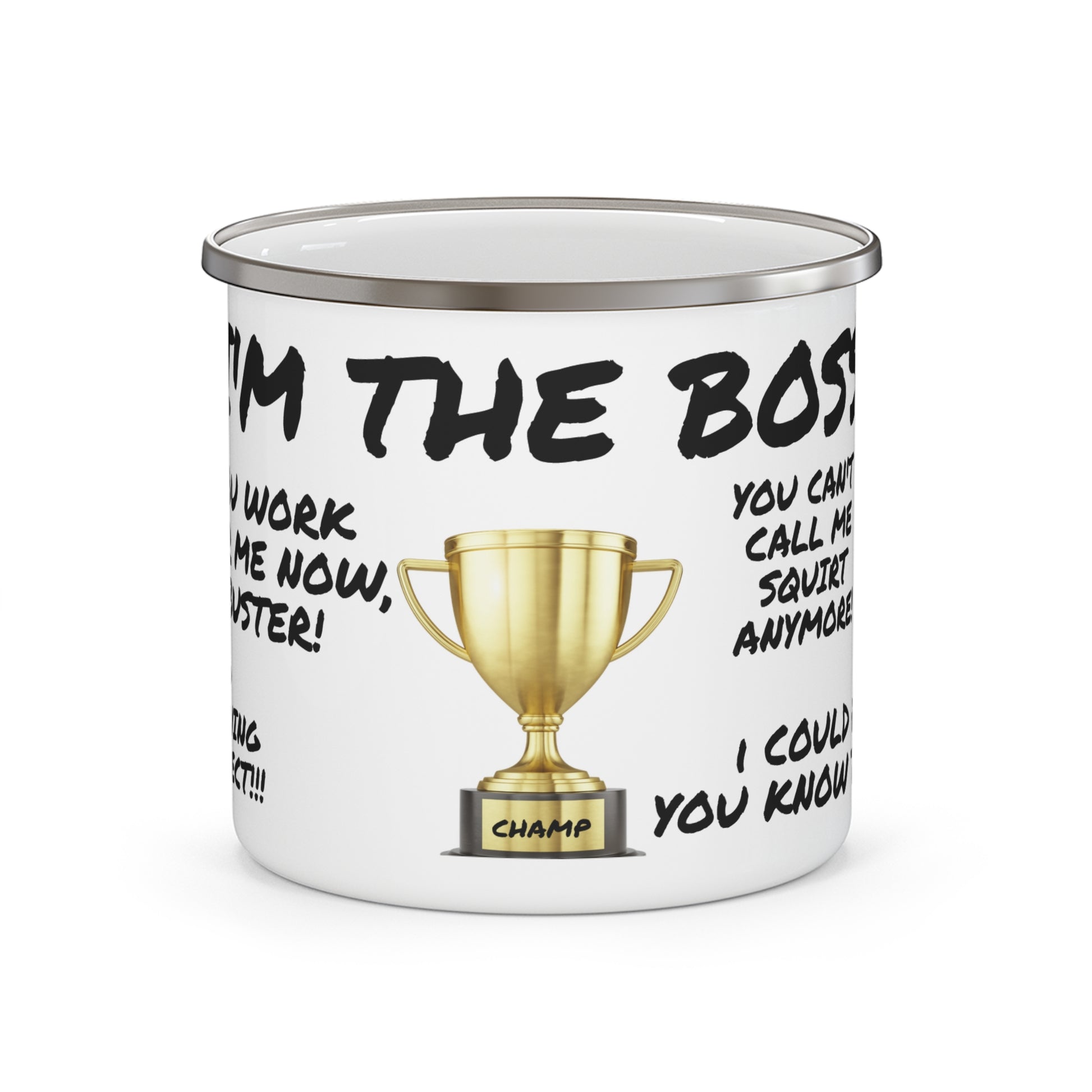 Upgrade your morning coffee routine with this enamel camping mug that showcases your recent promotion in style. Perfect for the new boss in town, this vibrant mug is both practical and stylish, making it a great addition to your daily routine or a thoughtful gift for a coworker's achievement. Ideal for celebrating career milestones, promotions, and work-related achievements.